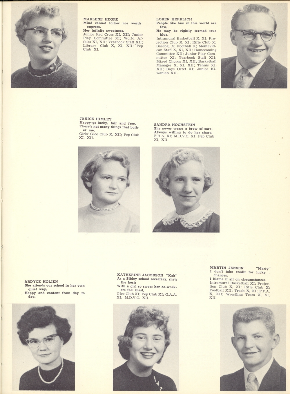 1957 Montevideo High School, Page 15: Marlene Hegre, Loren Herrlich, Janice Himley, Sandra Hochstein, Ardyce Holien, Katherine Jacobson, Martin Jensen.
