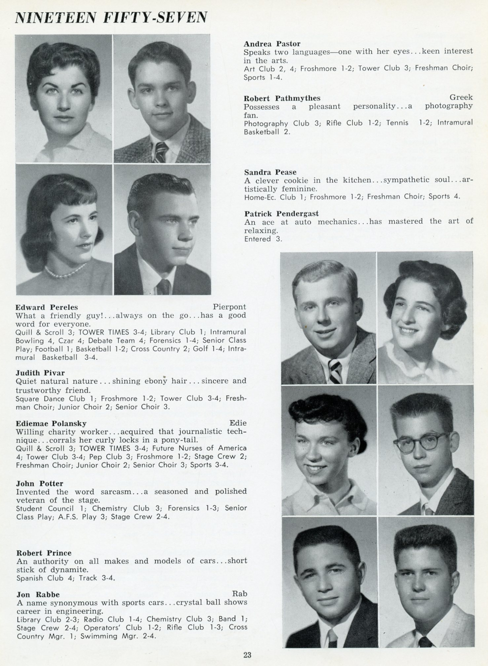 1957 Whitefish Bay High School, Page 23: Andrea Pastor, Robert Pathmythes, Sandra Pease, Patrick Pendergast, Edward Pereles, Judith Pivar, Ediemae Polansky, John Potter, Robert Prince, Jon Rabbe.