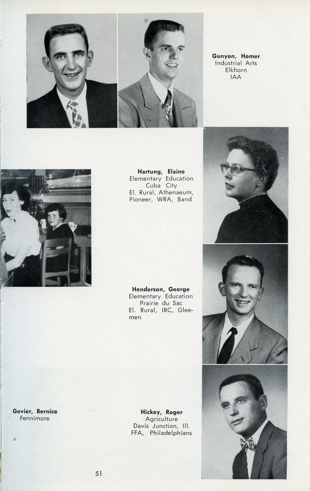 1957 Wisconsin State College Platteville Yearbook, Page 51: Donald Graham, Homer Gunyon, Elaine Hartung, George Henderson, Roger Hickey.