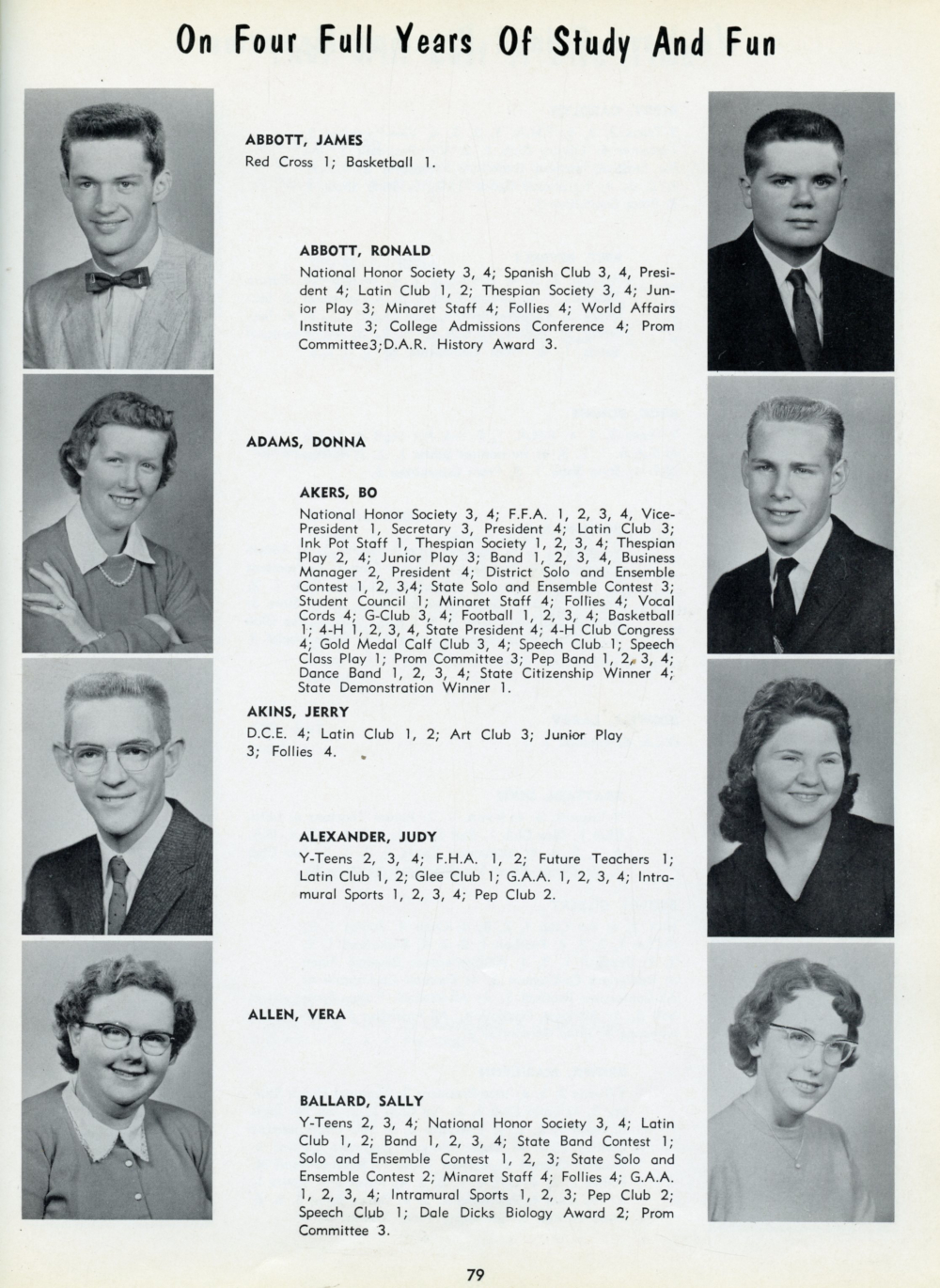 1959 Greencastle High School, Page 79: James Abbott, Ronald Abbott, Donna Adams, Bo Akers, Jerry Akins, Judy Alexander, Vera Allen, Sally Ballard.