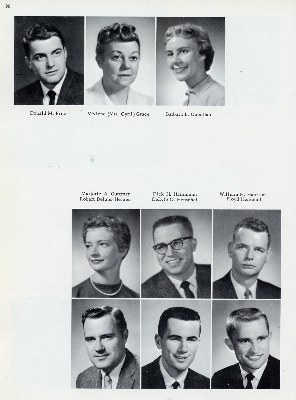 1960 Lakeland College Yearbook Page 90: Donald M. Fritz, Viviene (Mrs. Cyril) Grace, Barbara L. Guenther, Marjorie A. Gutzmer, Dick H. Hammann, William H. Harrison, Robert Delano Heinen, DeLyle O. Henschel, Floyd Henschel.