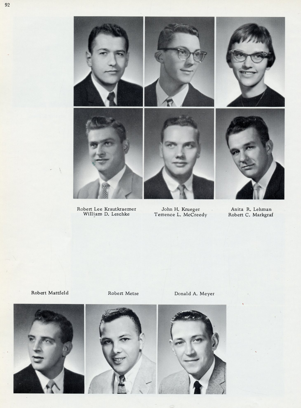 1960 Lakeland College Yearbook Page 92: Robert Lee Krautkraemer, John H. Krueger, Anita R. Lehman, William D. Leschke, Terrence L. McCreedy, Robert C. Markgraf, Robert Mattfeld, Robert Metze, Donald A. Meyer.