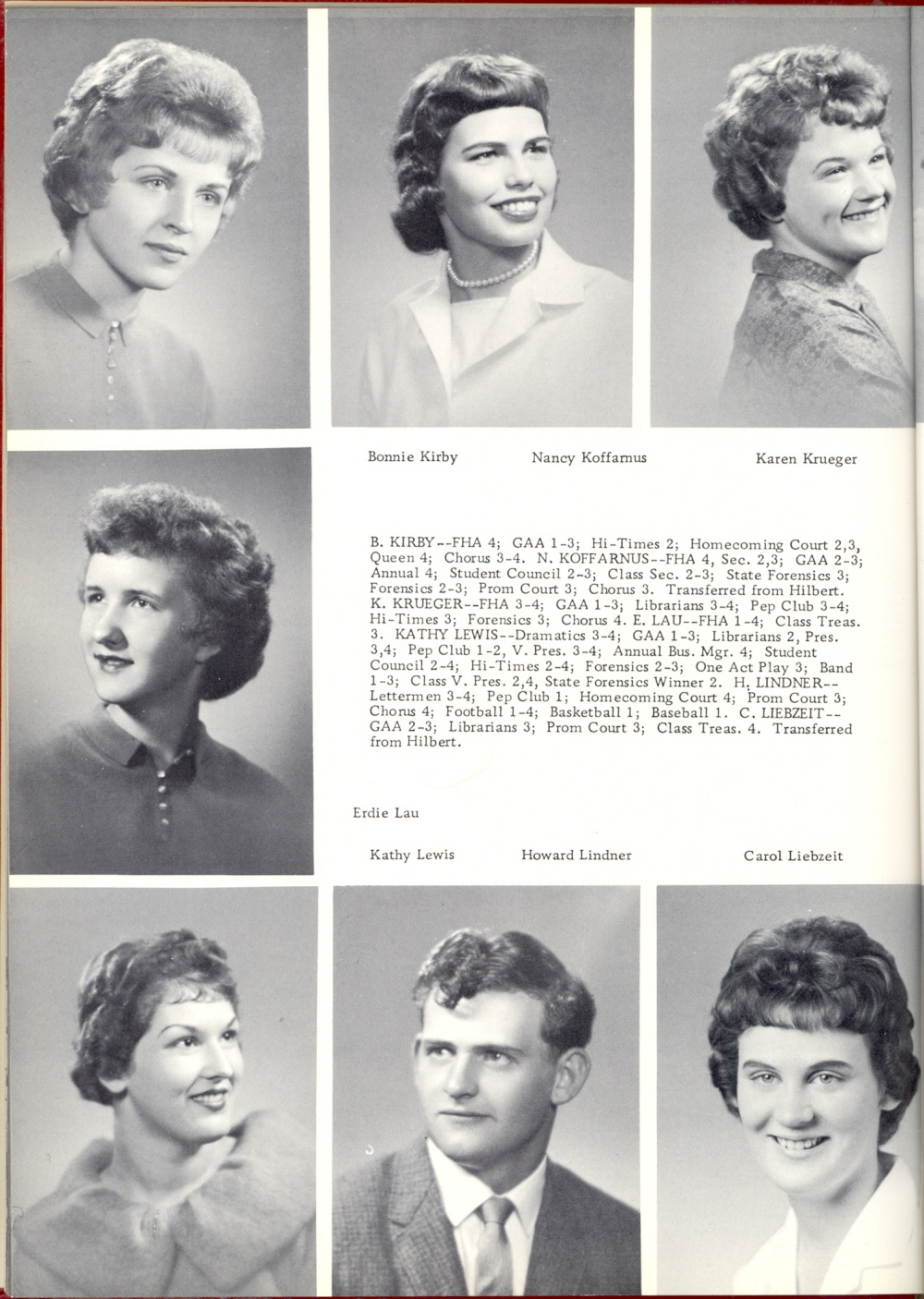 1961 Brillion High School, Page 60: Bonnie Kirby, Nancy Koffarnus, Karen Krueger, Erdie Lau, Kathy Lewis, Howard Lindner, Carol Liebzeit.