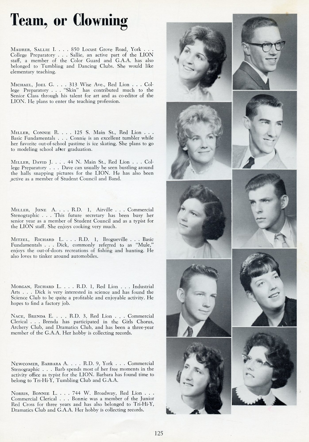 1962 Red Lion Area High School, Page 125: Sallie I. Maurer, Joel G. Michael, Connie R. Miller, David J. Miller, June A. Miller, Richard L. Mitzel, Richard L. Morgan, Brenda E. Nace, Barbara A. Newcomer, Bonnie L. Norris.