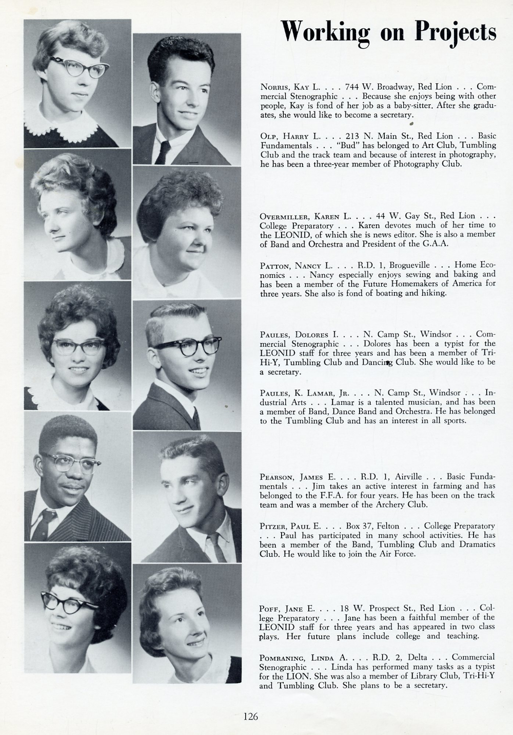 1962 Red Lion Area High School, Page 126: Kay L. Norris, Harry L. Olp, Karen L. Overmiller, Nancy L. Patton, Dolores I. Paules, K. Lamar Paules Jr., James E. Pearson, Paul E. Pitzer, Jane E. Poff, Linda A. Pomraning.