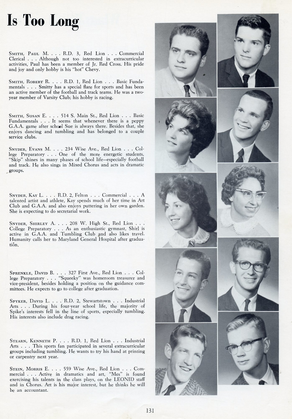 1962 Red Lion Area High School, Page 131: Paul M. Smith, Robert R. Smith, Susan E. Smith, Evans M. Snyder, Kay L. Snyder, Shirley A. Snyder, David B. Sprenkle, David L. Spyker, Kenneth P. Stearn, Morris E. Stein.