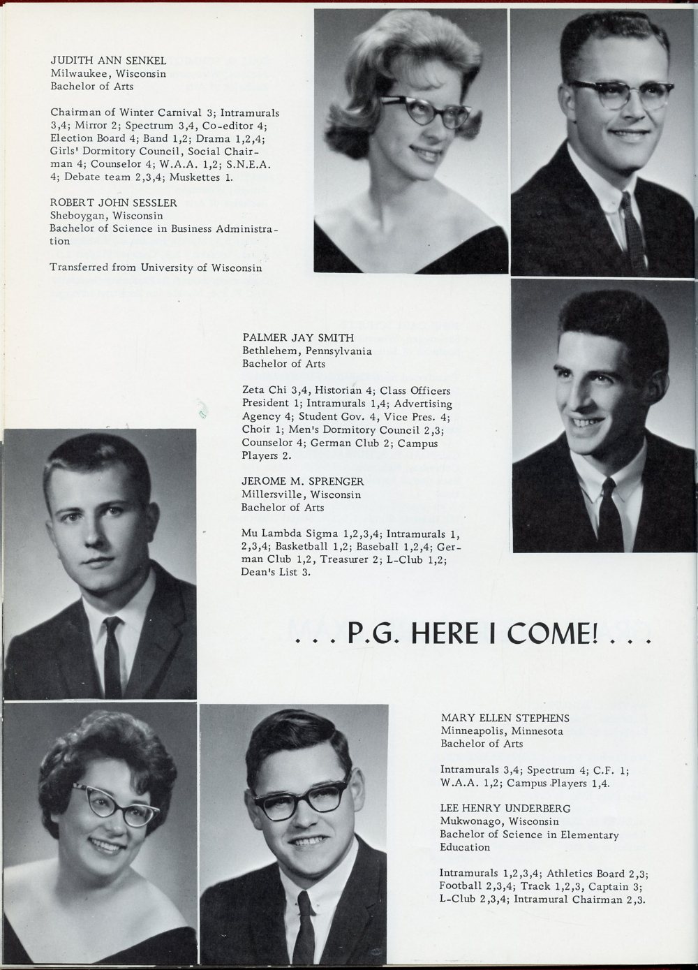 1963 Lakeland College Yearbook Page 36: Judith Ann Senkel, Robert John Sessler, Palmer Jay Smith, Jerome M. Sprenger, Mary Ellen Stephens, Lee Henry Underberg.