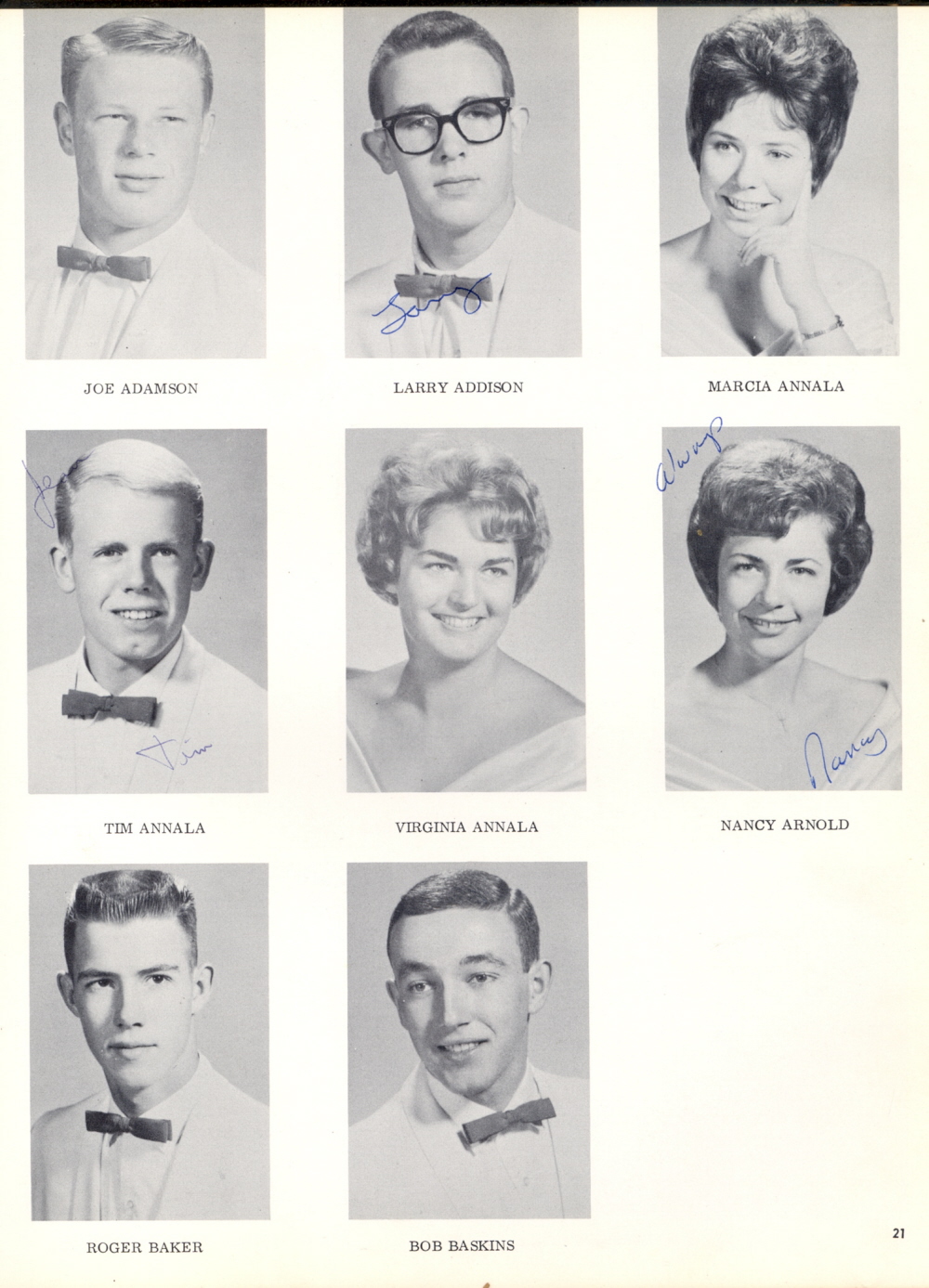 1964 Wy'east High School, Page 21: Joe Adamson, Larry Addison, Marcia Annala, Tim Annala, Virginia Annala, Nancy Arnold, Roger Baker, Bob Baskins.