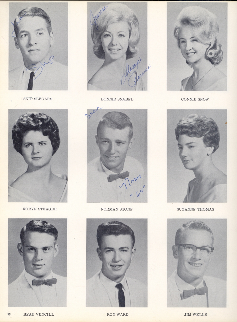 1964 Wy'east High School, Page 30: Skip Slegars, Bonnie Snabel, Connie Snow, Robyn Steager, Norman Stone, Suzanne Thomas, Beau Vincill, Ron Ward, Jim Wells.