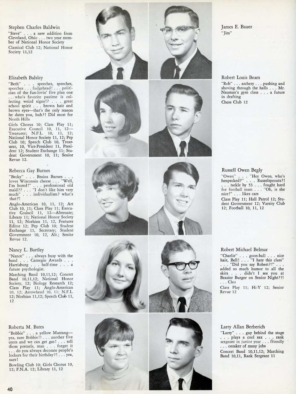 1967 North Hills High School, Page 40: Stephen Charles Baldwin, Elizabeth Balsley, Rebecca Gay Barnes, Nancy L. Bartley, Roberta M. Bates, James E. Bauer, Robert Louis Beam, Russell Owen Begly, Robert Michael Belmar, Larry Allen Berberich.