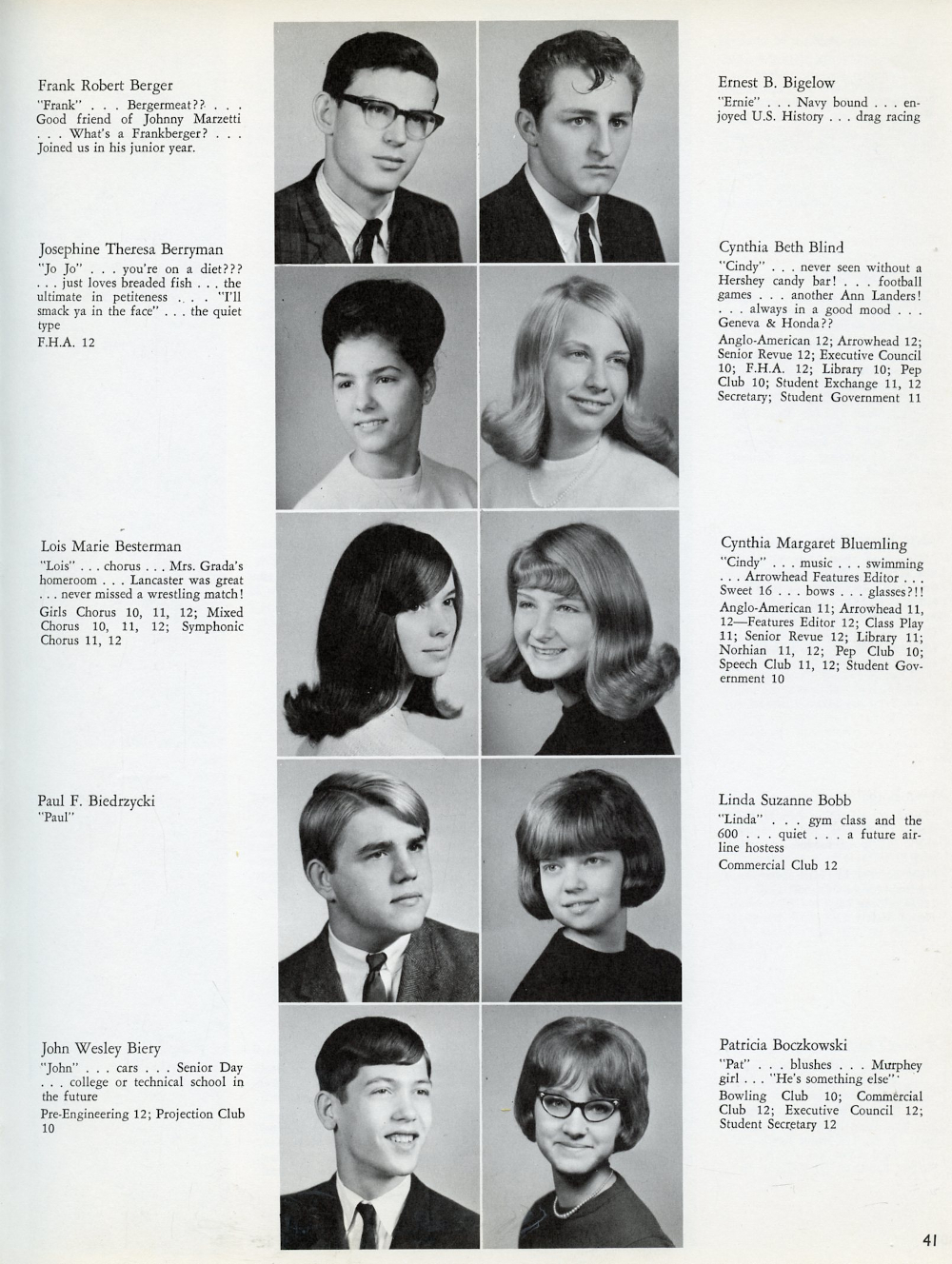 1967 North Hills High School, Page 41: Frank Robert Berger, Josephine Theresa Berryman, Lois Marie Besterman, Paul F. Biedrzycki, John Wesley Biery,