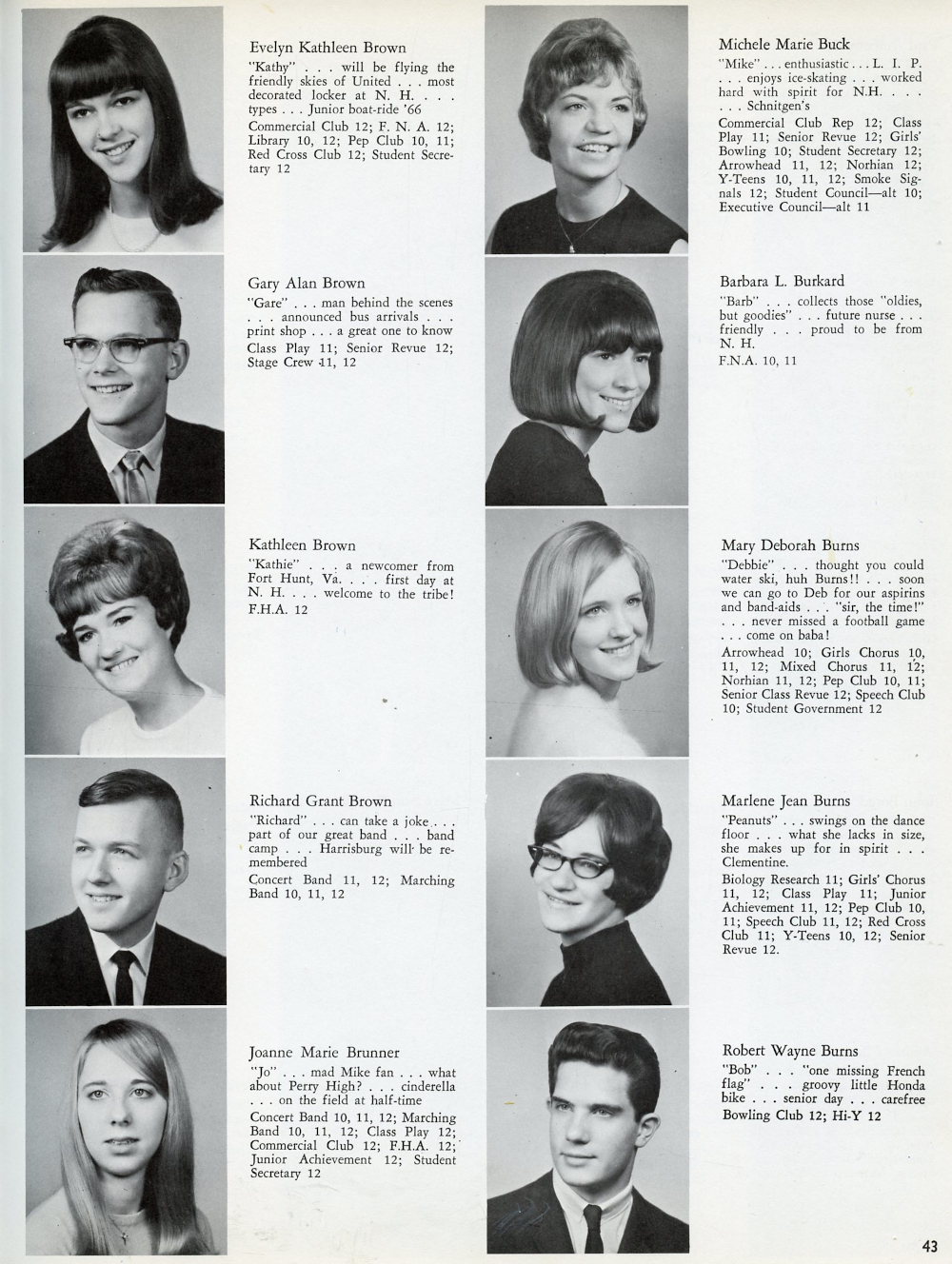 1967 North Hills High School, Page 43: Evelyn Kathleen Brown, Gary Alan Brown, Kathleen Brown, Richafd Grant Brown, Joanne Marie Brunner, Michele Marie Buck, Barbara L. Burkard, Mary Deborah Burns, Marlene Jean Burns, Robert Wayne Burns.