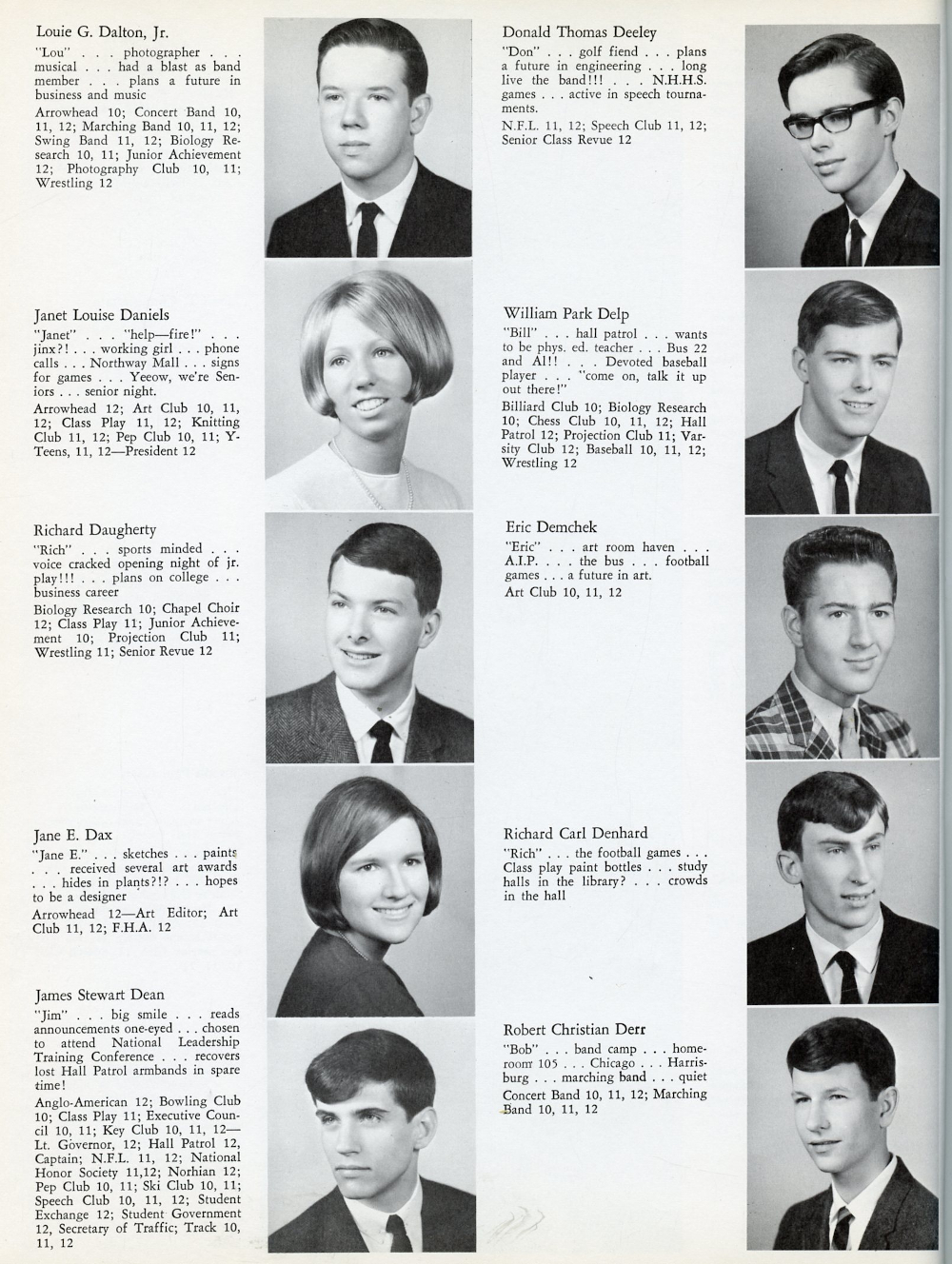 1967 North Hills High School, Page 48: Louie G. Dalton Jr., Janet Louise Daniels, Richard Daugherty, Jane E. Dax, James Stewart Dean, Donald Thomas Deeley, William Park Delp, Eric Demchek, Richard Carl Denhard, Robert Christian Derr.