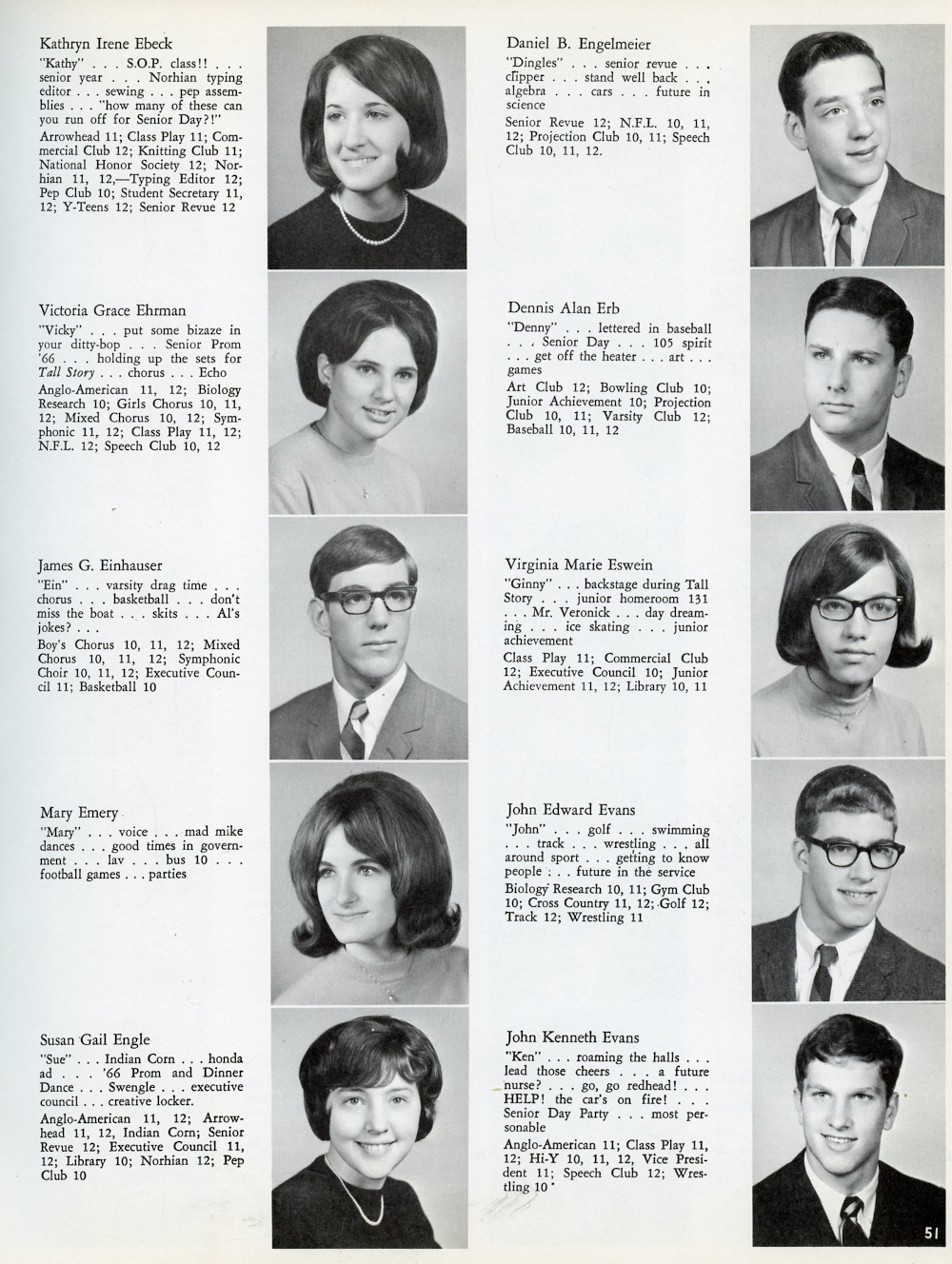 1967 North Hills High School, Page 51: Kathryn Irene Ebeck, Victoria Grace Ehrman, James G. Einhauser, Mary Emery, Susan Gail Engle, Daniel B. Engelmeier, Dennis Alan Erb, Virginia Marie Eswein, John Edward Evans, John Kenneth Evans.