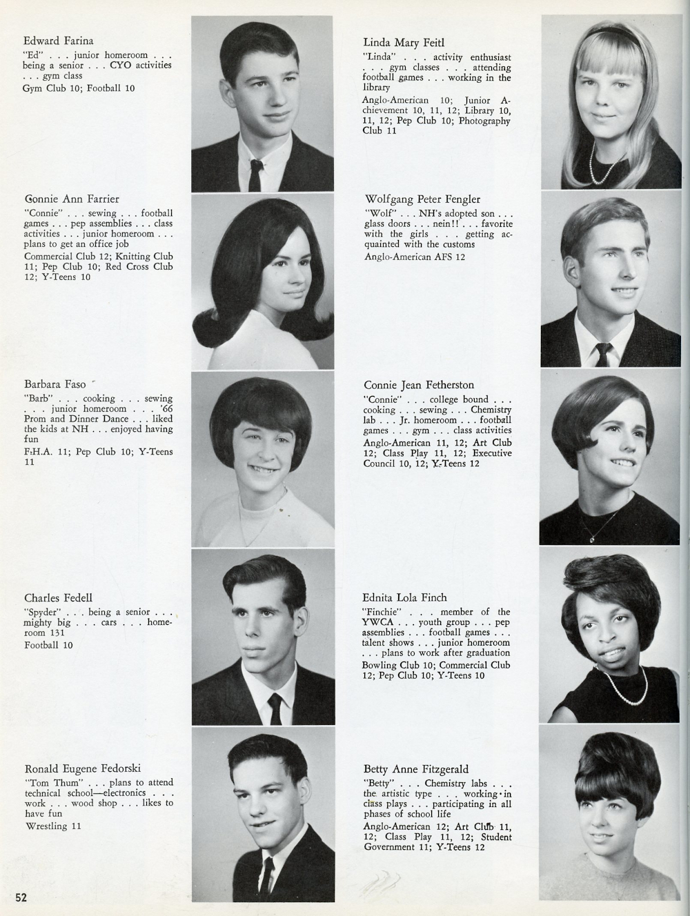 1967 North Hills High School, Page 52: Edward Farina, Gonnie Ann Farrier, Barbara Faso, Charles Fedell, Ronald Eugene Fedorski, Linda Mary Feitl, Wolfgang Peter Fengler, Connie Jean Fetherston, Ednita Lola Finch, Betty Anne Fitzgerald.