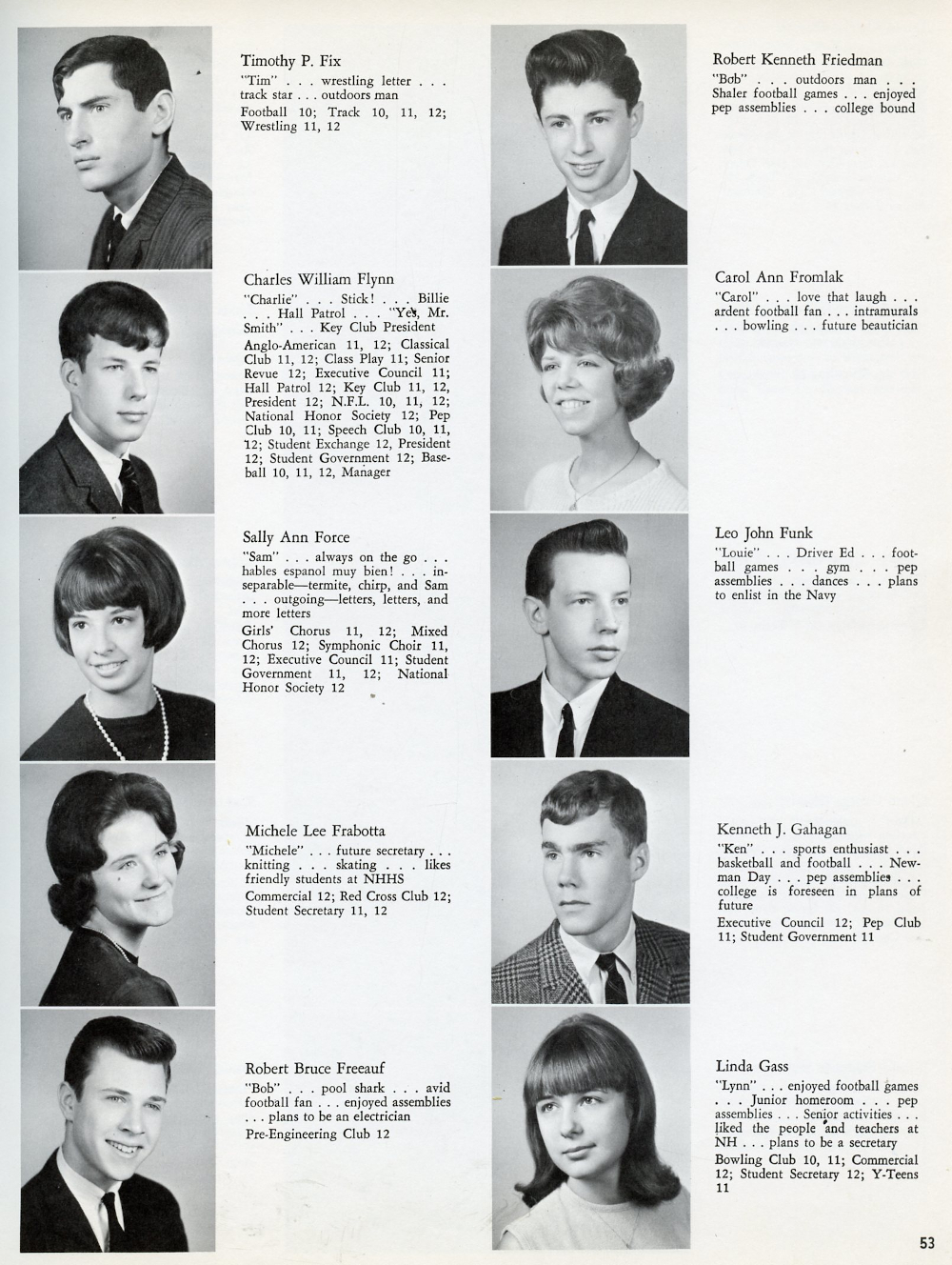 1967 North Hills High School, Page 53: Timothy P. Fix, Charles William Flynn, Sally Ann Force, Michele Lee Frabotta, Robert Bruce Freeauf, Robert Kenneth Friedman, Carol Ann Fromlak, Leo John Funk, Kenneth J. Gahagan, Linda Gass.