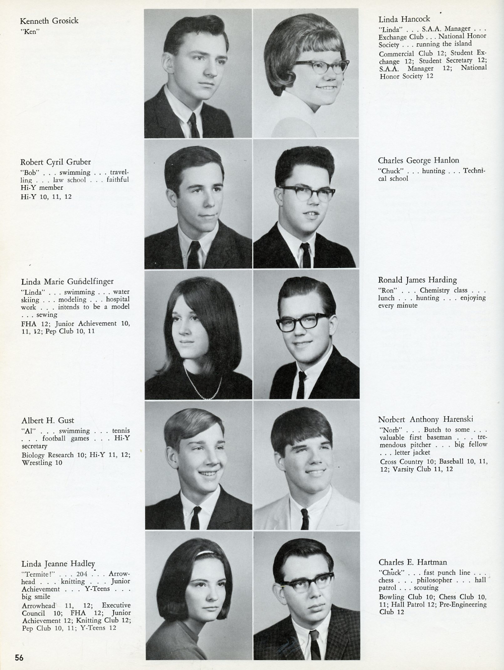 1967 North Hills High School, Page 56: Kenneth Grosick, Robert Cyril Gruber, Linda Marie Gundelfinger, Albert H. Gust, Linda Jeanne Hadley, Linda Hancock, Charles George Hanlon, Ronald James Harding, Norbert Anthony Harenski, Charles E. Hartman.