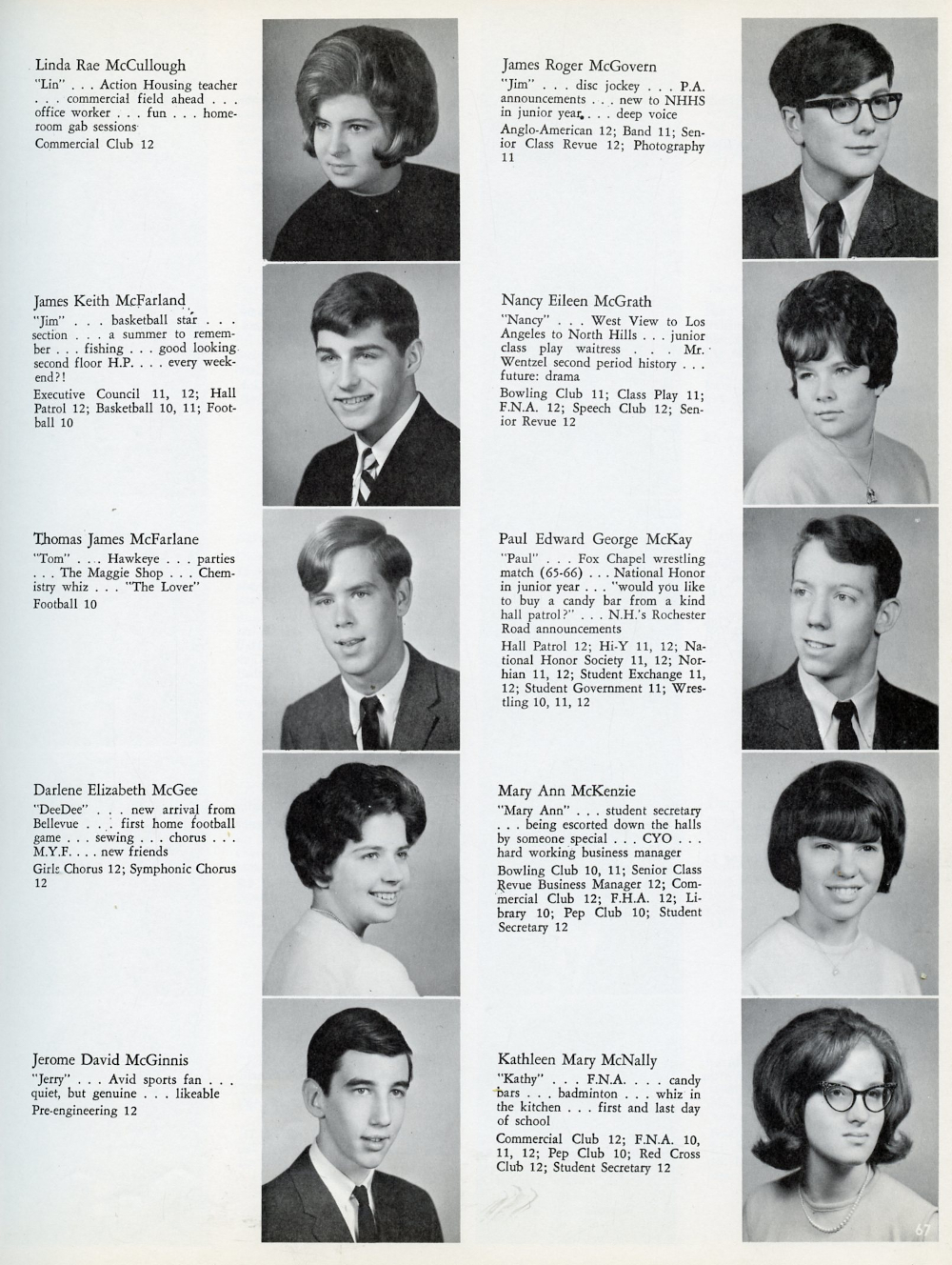 1967 North Hills High School, Page 67: Linda Rae McCullough, James Keith McFarland, Thomas James McFarlane, Darlene Elizabeth McGee, Jerome David McGinnis,