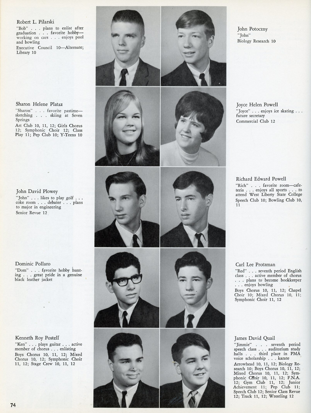 1967 North Hills High School, Page 74: Robert L. Pilarski, Sharon Helene Plataz, John David Plowey, Dominic Pollaro, Kenneth Roy Postell, John Potoczny, Joyce Helen Powell, Richard Edward Powell, Carl lee Protzman, James David Quail.