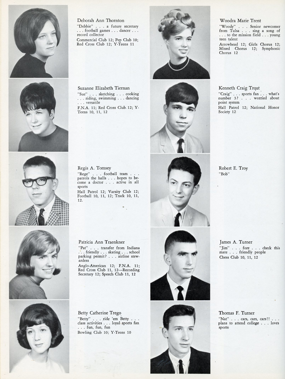 1967 North Hills High School, Page 84: Deborah Ann Thornton, Suzanne Elizabeth Tiernan, Regis A. Tomsey, Patricia Ann Traenkner, Betty Catherine Trego, Woodra Marie Trent, Kenneth Craig Trout, Robert E. Troy, James A. Turner, Thomas F. Turner.