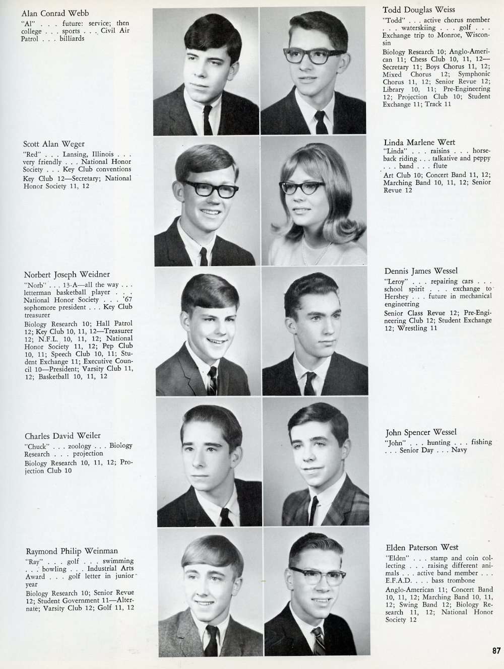 1967 North Hills High School, Page 87: Alan Conrad Webb, Scott Alan Weger, Norbert Joseph Weidner, Charles David Weiler, Raymond Philip Weinman, Todd Douglas Weiss, Linda Marlene Wert, Dennis James Wessel, John Spencer Wessel, Elden Paterson West.