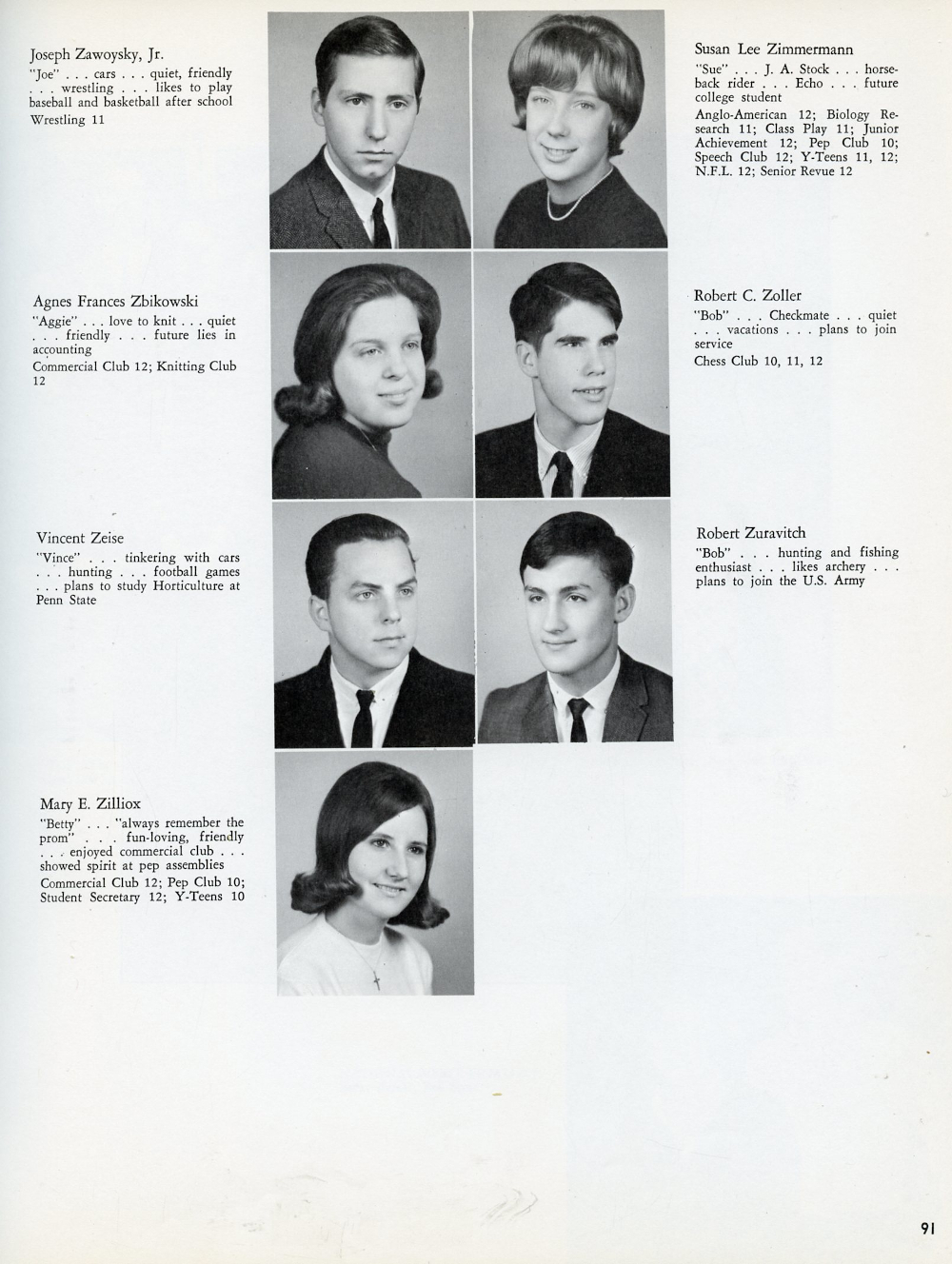 1967 North Hills High School, Page 91: Joseph Zawoysky Jr., Agnes Frances Zbikowski, Vincent Zeise, Mary E. Zilliox, Susan Lee Zimmermann, Robert C. Zoller, Robert Zuravitch.