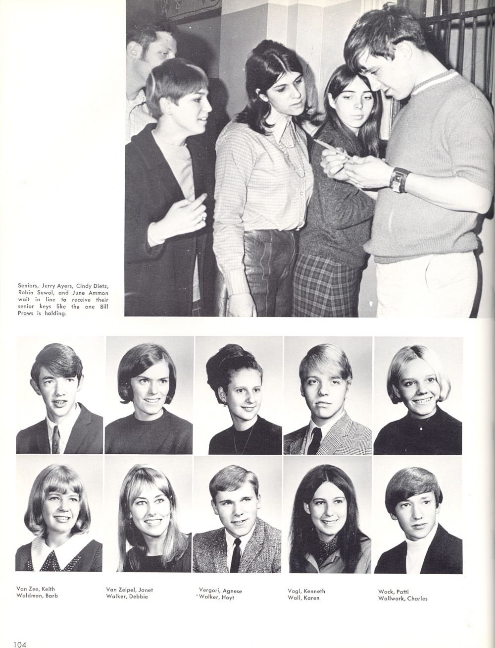 1969 Ulysses S. Grant High School, Page 104: Keith Van Zee, Janet Van Zeipel, Agnese Vergori, Kenneth Vogl, Patti Wack, Barb Waldman, Debbie Walker, Hoyt Walker, Karen Wall, Charles Wallwork.