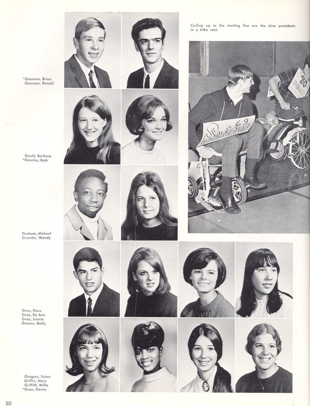 1969 Ulysses S. Grant High School, Page 80: Brian Gossman, Ronald Gossman, Barbara Gould, Beth Gourley, Michael Graham, Wendy Grander, Dave Gray, De Ann Gray, Jeanie Gray, Molly Greene, Susan Gregory, Mary Griffin, Willa Griffith, Dorice Gross.