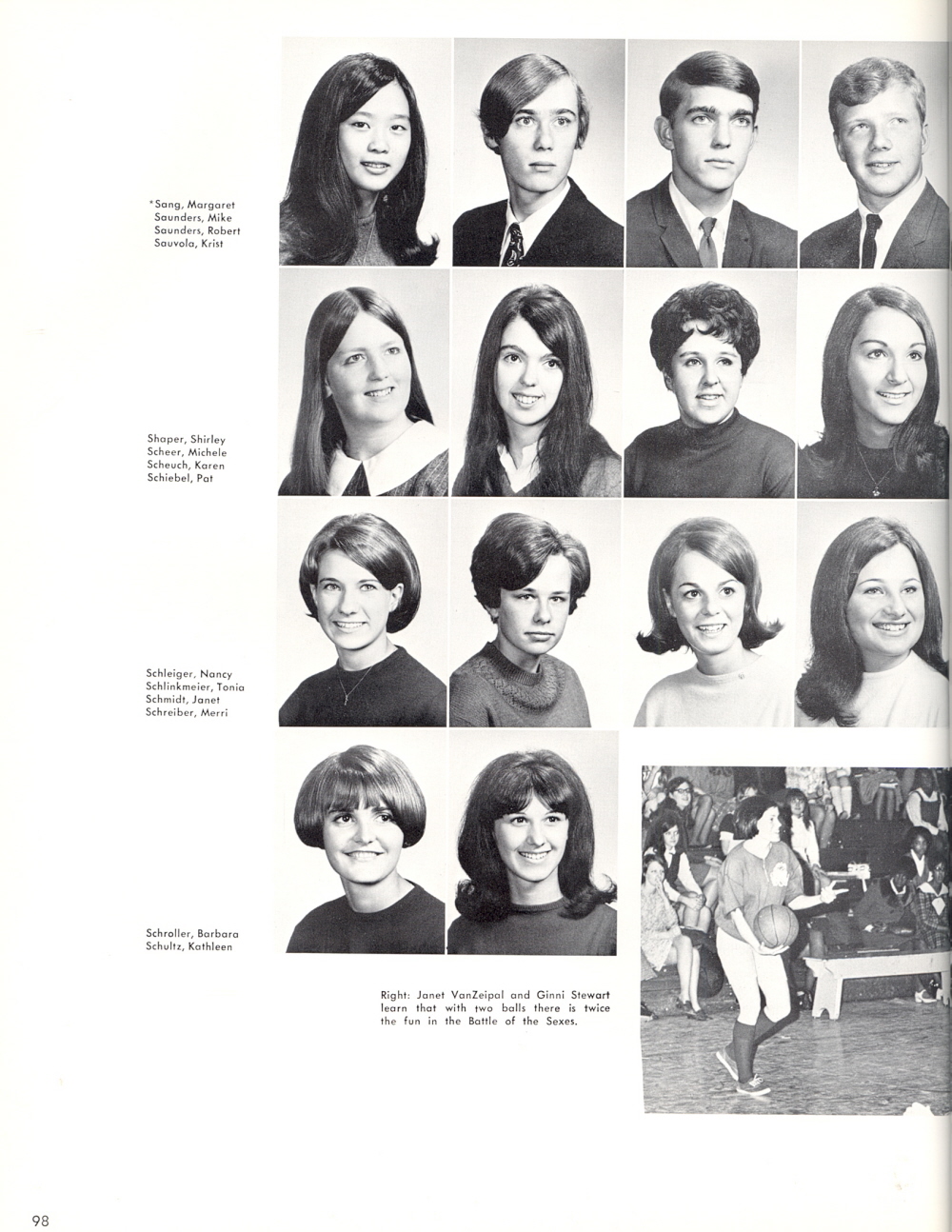 1969 Ulysses S. Grant High School, Page 98: Margaret Sang, Mike Saunders, Robert Saunders, Krist Sauvola, Shirley Shaper, Michele Scheer, Karen Scheuch, Pat Schiebel, Nancy Schleiger, Tonia Schlinkmeier, Janet Schmidt, Merri Schreiber, Barbara Schroller, Kathleen Schultz.
