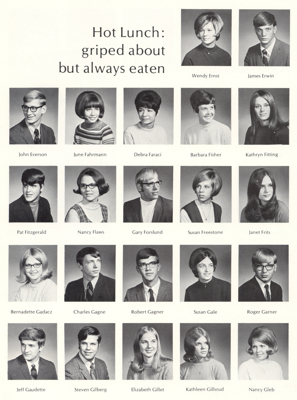 1970 Irondale High School, Page 28: Wendy Ernst, James Erwin, John Everson, June Fahrmann, Debra Faraci, Barbara Fisher, Kathryn Fitting, Pat Fitzgerald, Nancy Flaws, Gary Forslund, Susan Freestone, Janet Frits, Bernadette Gadacz, Charles Gagne, Robert Gagner, Susan Gale, Roger Garner, Jeff Gaudette, Steven Gilberg, Elizabeth Gillet, Kathleen Gillsrud, Nancy Gleb.