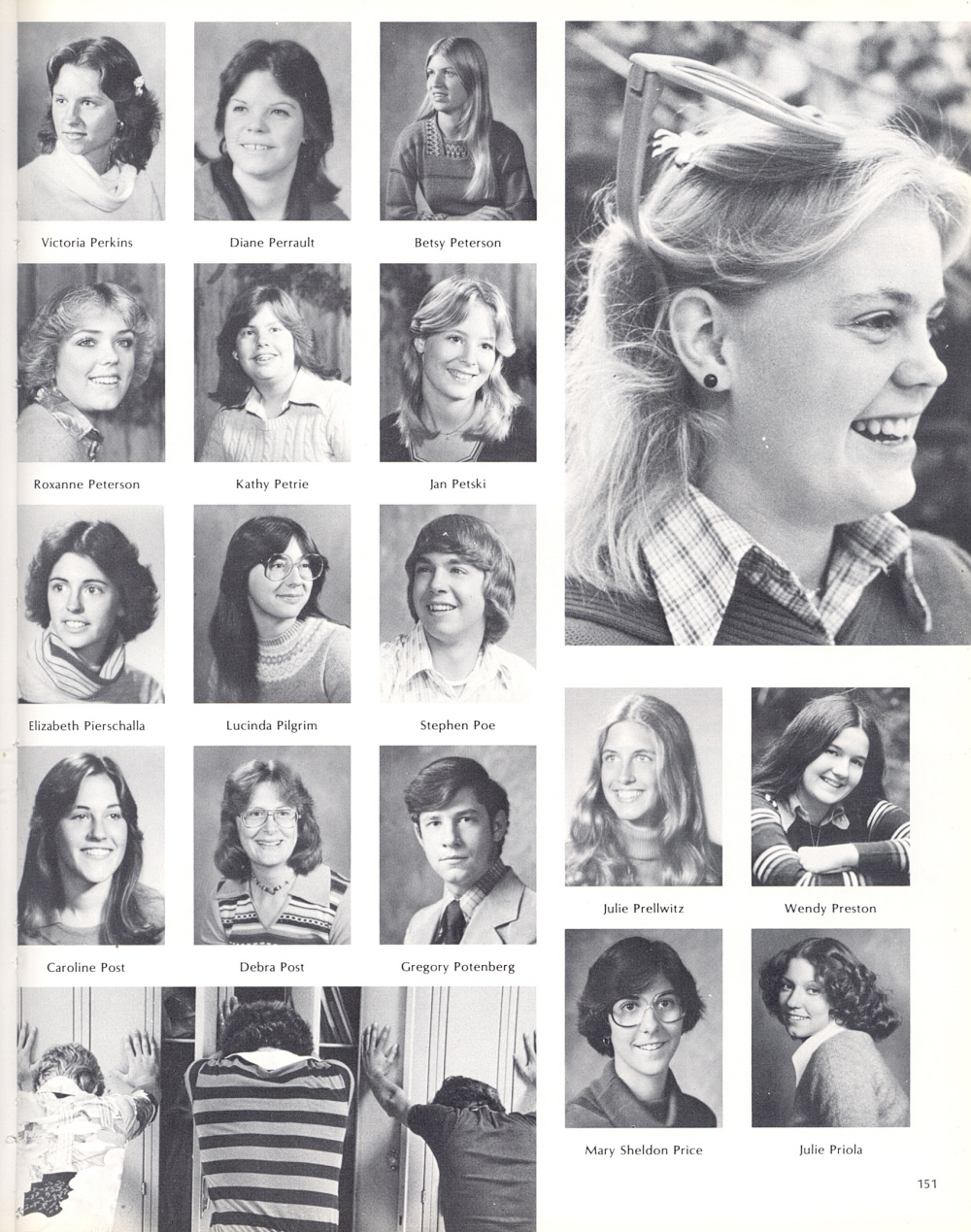 1978 Oconomowoc Cooney High School, Page 151: Victoria Perkins, Diane Perrault, Betsy Peterson, Roxanne Peterson, Kathy Petrie, Jan Petski, Elizabeth Pierschalla, Lucinda Pilgrim, Stephen Poe, Caroline Post, Debra Post, Gregory Potenberg, Julie Prellwitz, Wendy Preston, Mary Sheldon Price, Julie Priola.