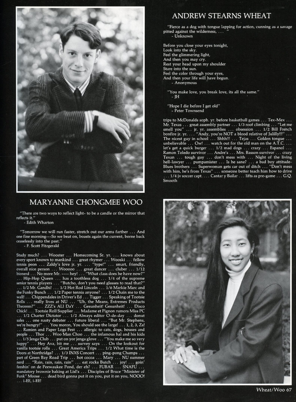 1992 University School of Milwaukee High School, Page 67: Andrew Stearns Wheat, Maryanne Chongmee Woo.
