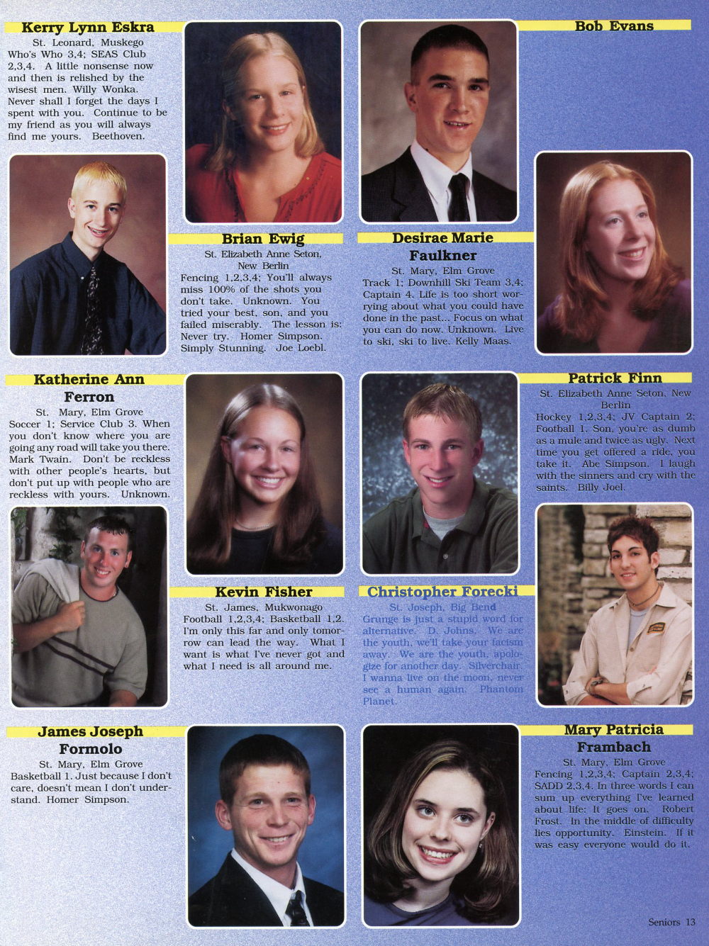 2001 Waukesha Catholic Memorial High School Yearbook Page 13: Kerry Lynn Eskra, Bob Evans, Brian Ewig, Desirae Marie Faulkner, Katherine Ann Ferron, Patrick Finn, Kevin Fisher, Christopher Forecki, James Joseph Formolo, Mary Patricia Frambach.