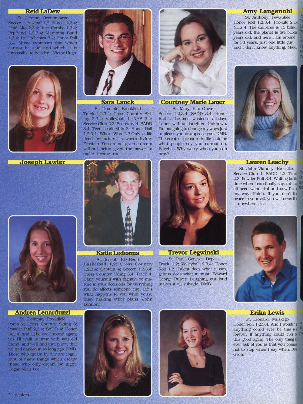 2001 Waukesha Catholic Memorial High School Yearbook Page 20: Reid LaDew, Amy Langenohl, Sara Lauck, Courtney Marie Lauer, Joseph Lawler, Lauren Leachy, Katie Ledesma, Trevor Legwinski, Andrea Lenarduzzi, Erika Lewis.